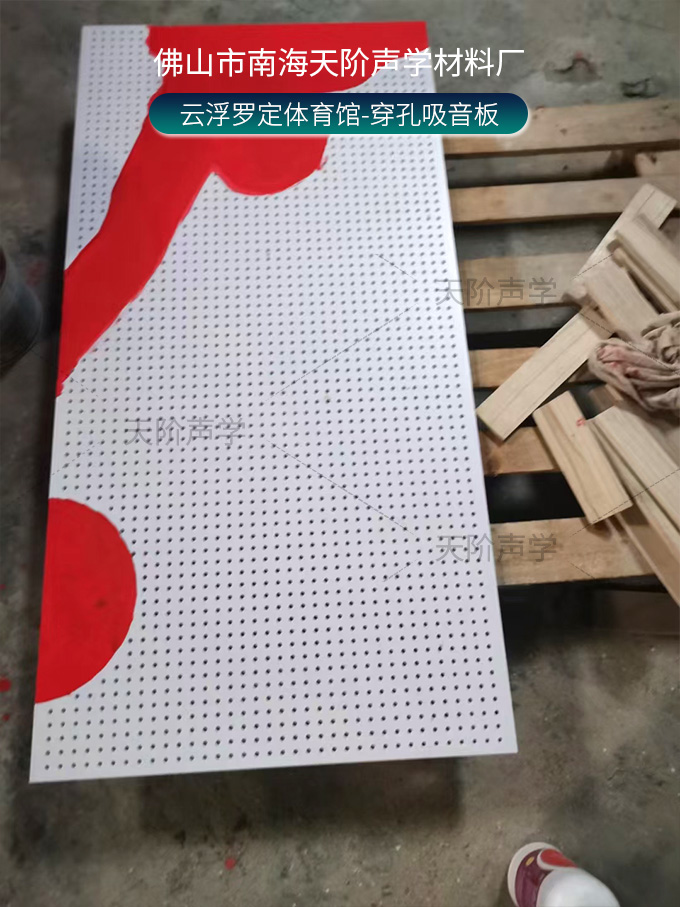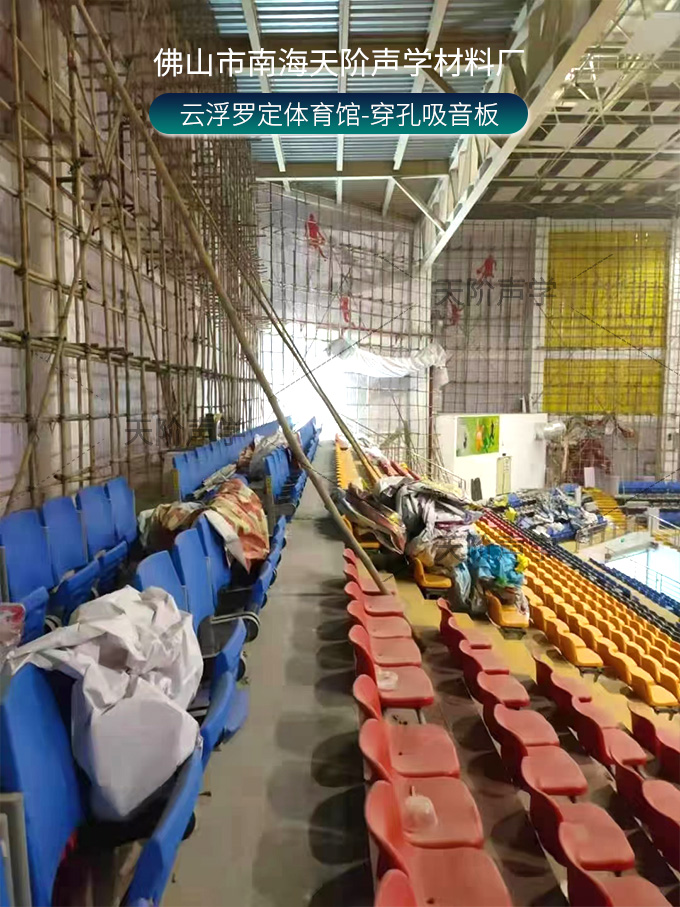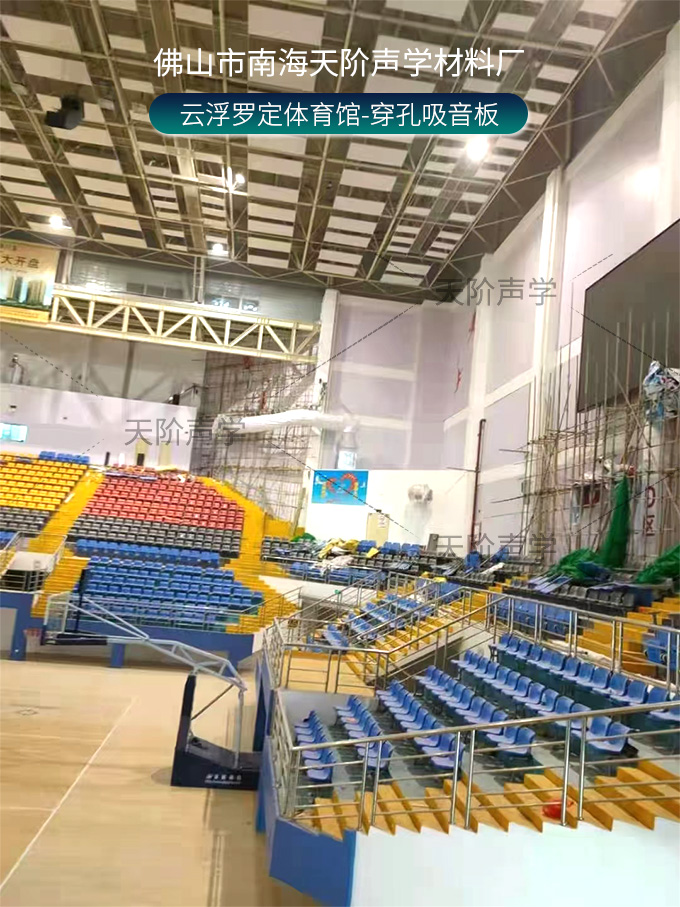 云浮羅定體育場項目改造中,使用平板吊頂空間吸聲體用頂部吸音裝飾;墻面選用白色飾面的穿孔吸音板,基材選用不燃的玻鎂基材,運動造型的穿孔設計,活力動感,有出色的降噪效果。