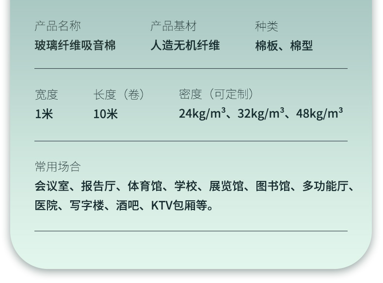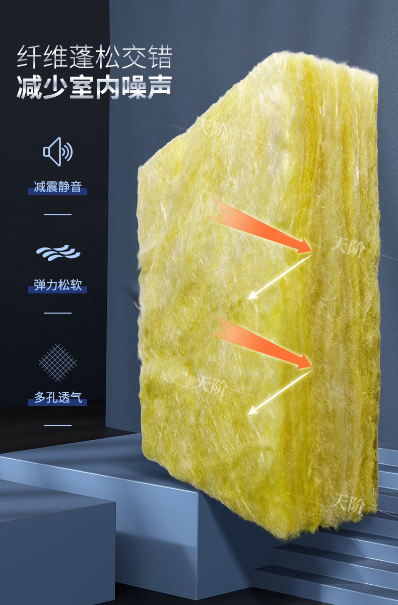離心玻璃棉內部纖維蓬松交錯,存在大量微小的孔隙,是典型的多孔性吸聲材料,具有良好的吸聲特性。離心玻璃棉可以制成墻板、天花板、空間吸聲體等,可以大量吸收房間內的聲能,降低混響時間,減少室內噪聲。