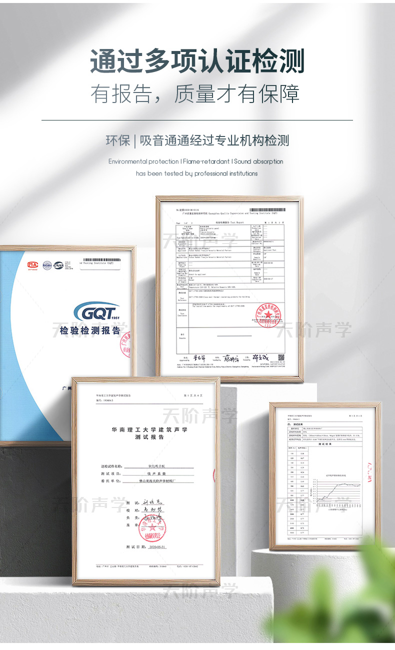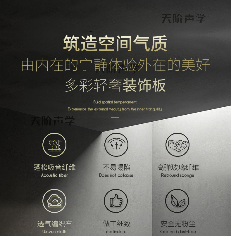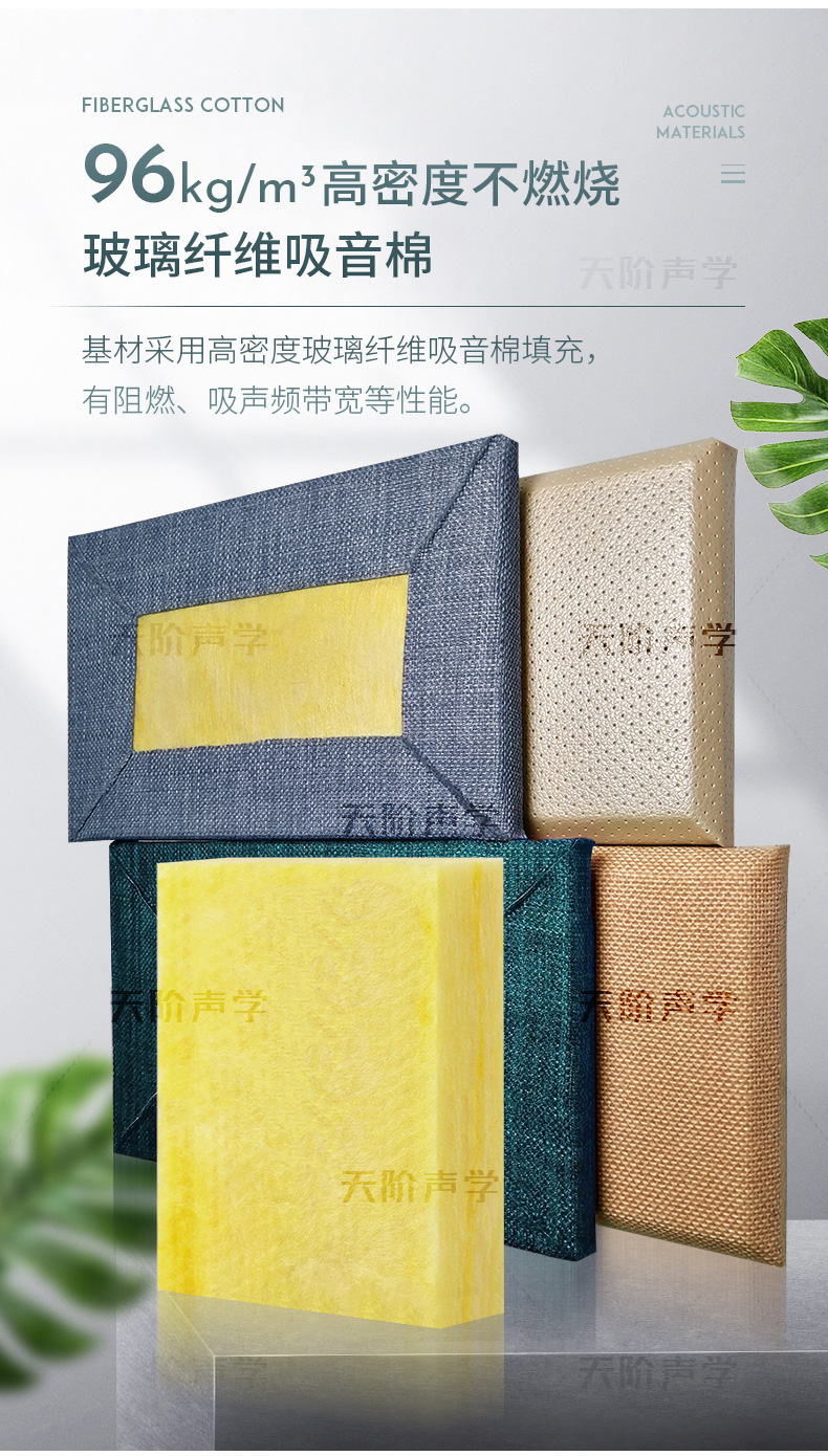 天階聲學布藝吸聲板采用高質(zhì)的96kg/m3玻璃吸音棉。具有環(huán)保、阻燃、吸聲頻帶寬、裝飾性強、施工簡單、無粉塵污染等性能,飾面顏色及材料選擇性廣,能很好地滿足客戶多樣化的聲學及裝飾需求。