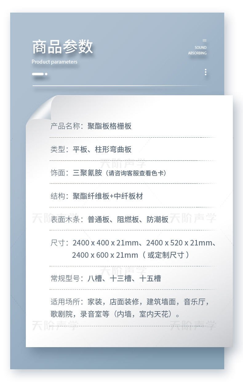 適用于多種場所:多種飾面,滿足不同風(fēng)格家裝,店面裝修,辦公室,建筑墻面,廣告牌制作,音樂廳,歌劇院,錄音室等(內(nèi)外墻,室內(nèi)天花)。