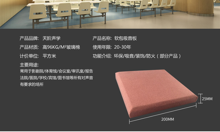 天階-防撞布藝軟包吸音板又叫吸音軟包,采用阻燃樹脂邊框或木質邊框或鋁質邊框內放置,防火的特物吸聲棉,外包防火吸聲布藝或環保皮,牛皮等制成。防火處理后達到國家級防火GB 8624 2006 C級(同GB 8624 2012-B1級)要求。天階聲學生產的布藝吸音板,具有環保、防火、吸聲頻帶寬、裝飾性強、施工簡單,無粉塵污染等性能,飾面顏色及材料選擇性廣。