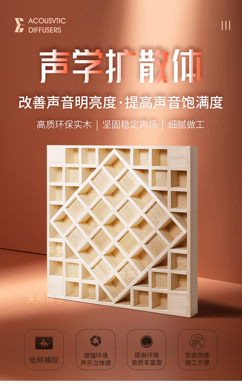 音樂廳Pyramid擴散體主要使用在廳堂的臺口及兩側的耳光處,作用是把本來入射到側墻的聲波反射擴散到廳堂中,避免引起聲染色聲聚焦和駐波的聲學缺陷,使音質更細膩精確。廣泛應用于音樂廳、多功能廳、大禮堂等場所。
