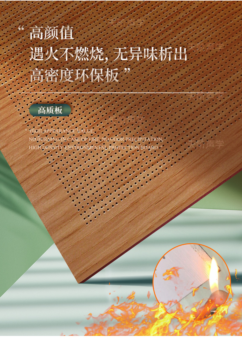 天階聲學孔木吸音板采用高質的中纖板、具有環保、防火、防潮等性能,飾面顏色及材料選擇性廣,能很好地滿足客戶多樣化的聲學及裝飾需求。較槽木吸音板,孔木吸音板相對抗撞擊能力強。
