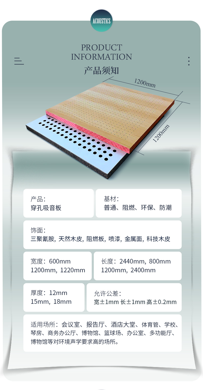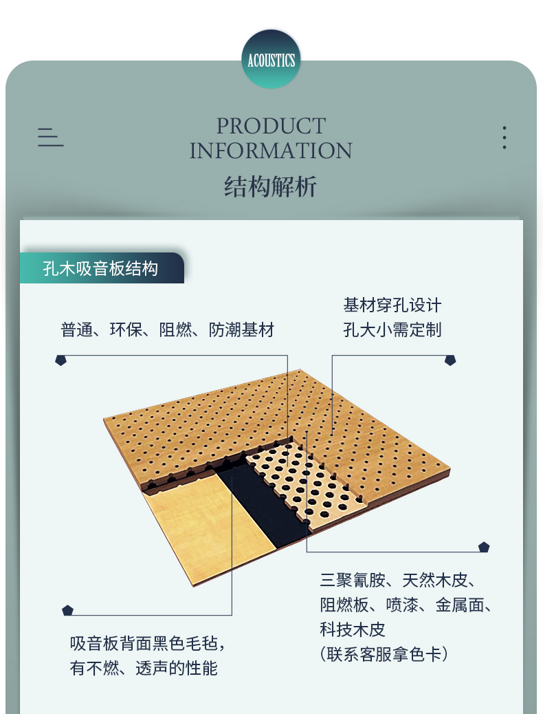 本公司專業生產木質吸音板,布藝吸聲板、吸音軟包、木絲吸音板、聚酯纖維吸聲板、蜂窩陶瓷吸音板、隔音板、空間吸聲體、擴散體、隔音材料、干掛板與聲學活動隔斷、固定高隔間等多種聲學品類。
